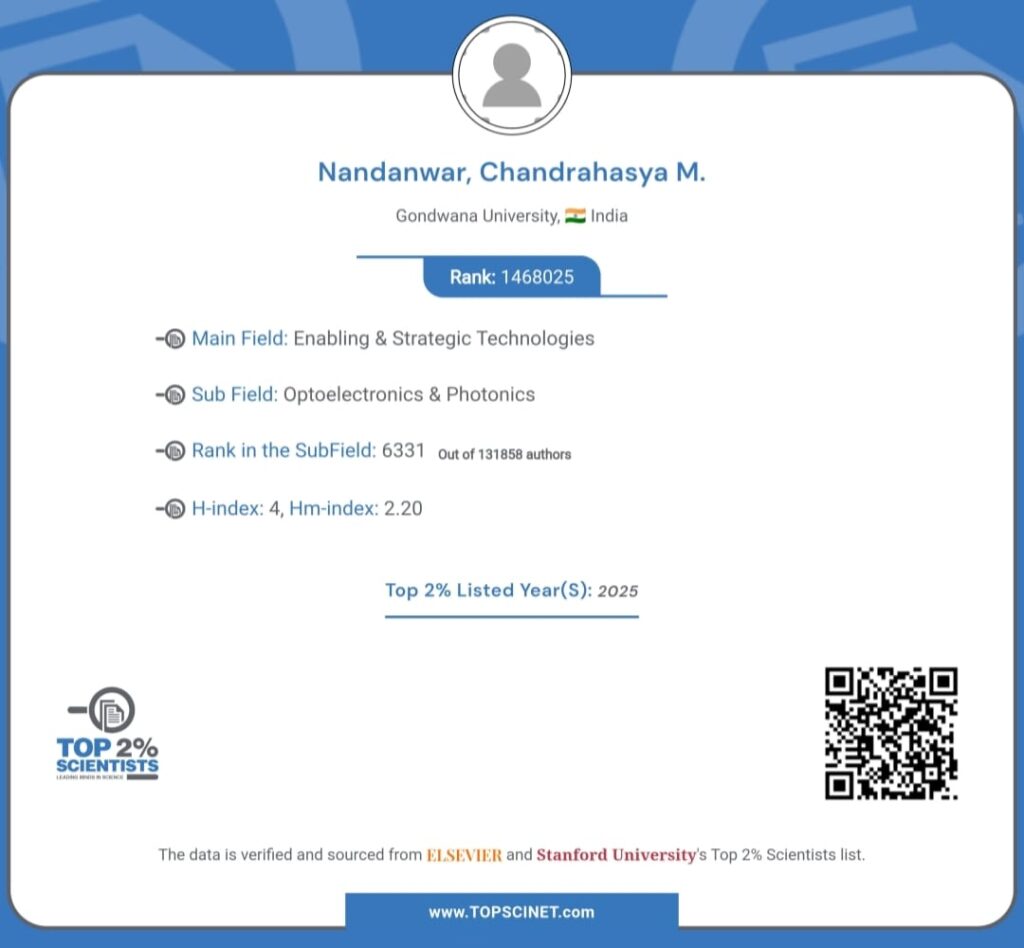 या यादीत समाविष्ट झालेल्या मान्यवर संशोधकांमध्ये डॉ. चंद्रहास्य नंदनवार (भौतिकशास्त्र) यांचा समावेश आहे. त्यांचे हे यश केवळ वैयक्तिक योगदानाचे द्योतक नसून संस्थेच्या राष्ट्रीय (NIRF) तसेच आंतरराष्ट्रीय संशोधन प्रगतीतील वाढत्या प्रतिमेचे प्रतीक आहे.